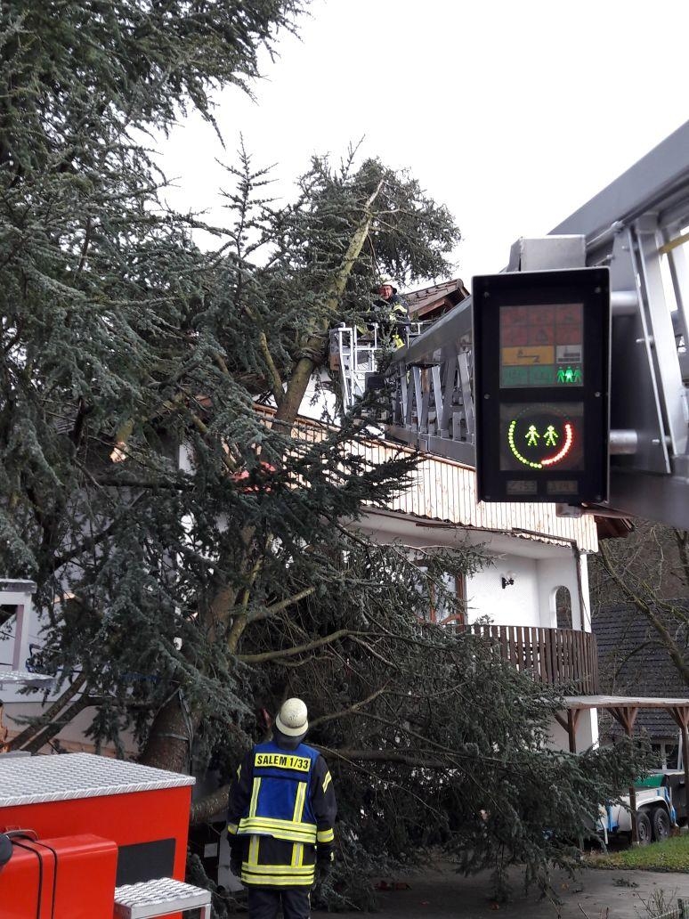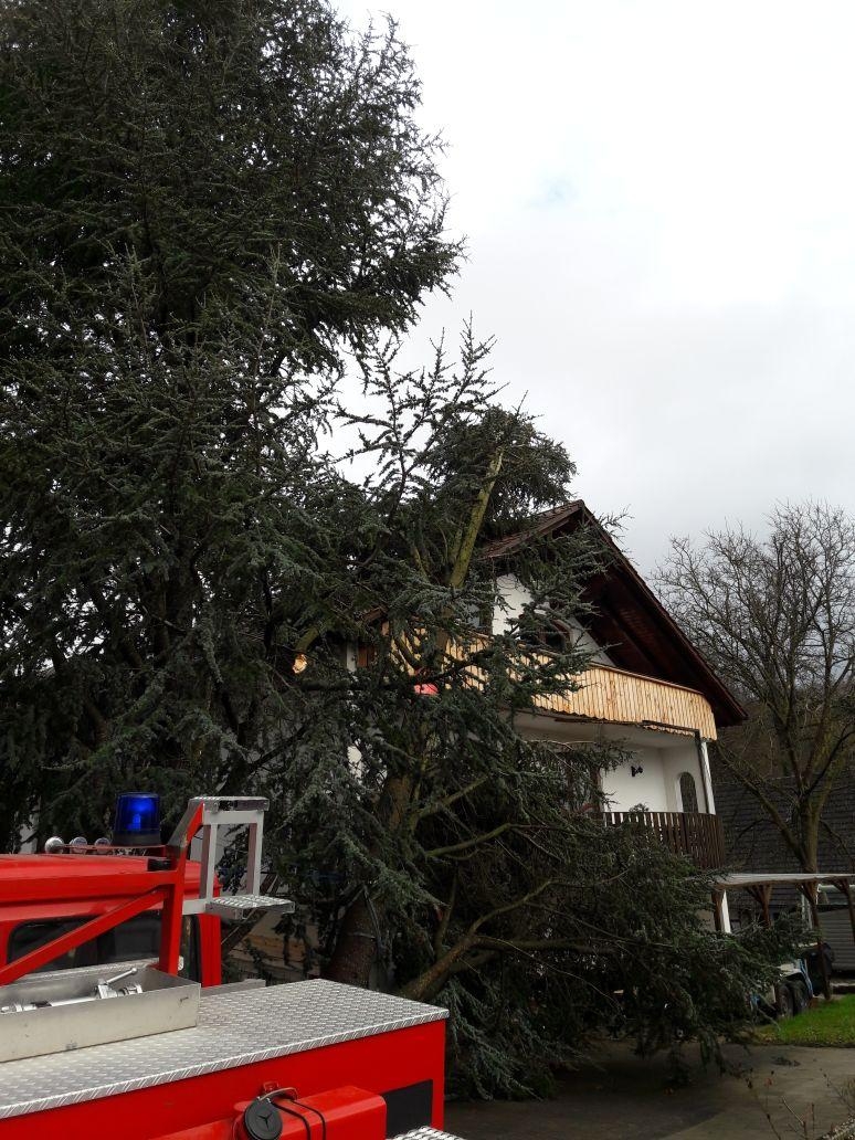Ein Anrufer meldet, dass zwischen Beuren und Betenbrunn ein Baum über der Strasse liegt, welcher ein Stromkabel abgerissen hat. Bei der Erkundung stellte es sich heraus: Der umstürzende Baum hat eine Telefonleitung mit heruntergerissen. Da somit eine Gefährdung durch Strom ausgeschlossen werden konnte, beseitigten die erkundenden Kräfte den Baum durch Muskelkraft.