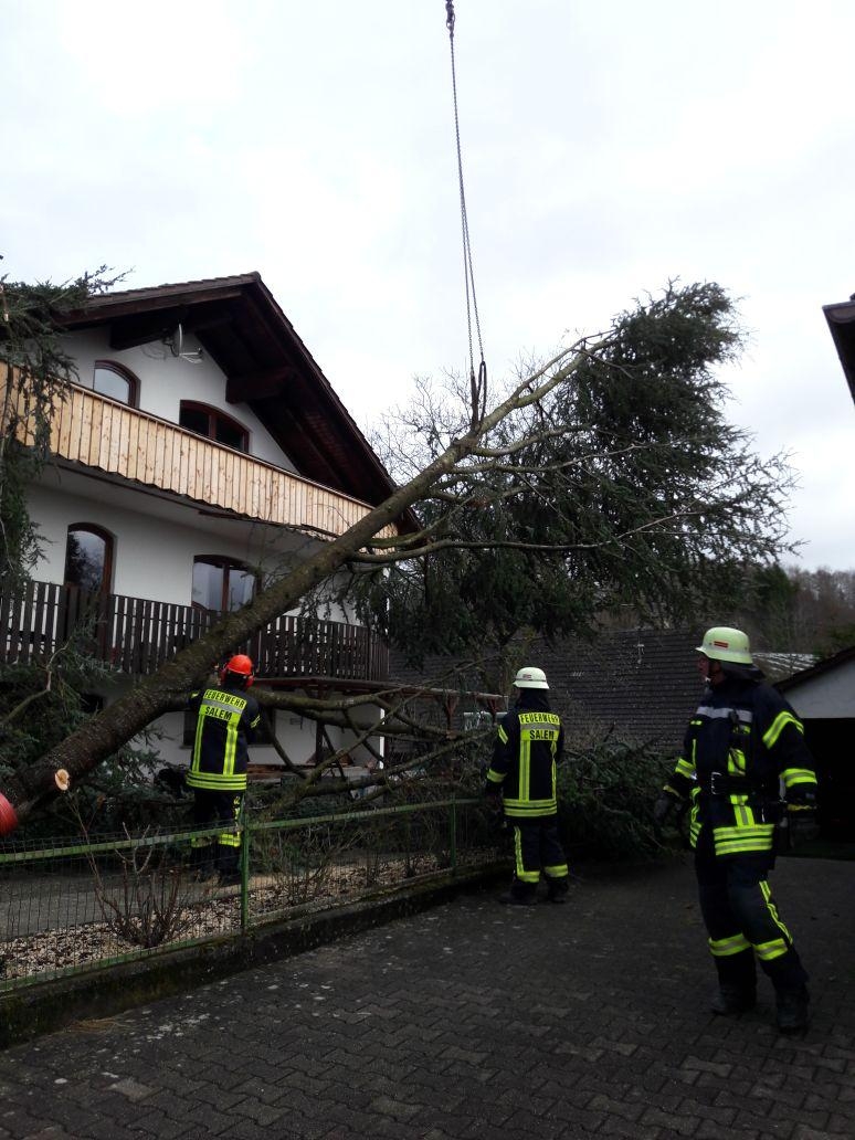 Ein Anrufer meldet, dass zwischen Beuren und Betenbrunn ein Baum über der Strasse liegt, welcher ein Stromkabel abgerissen hat. Bei der Erkundung stellte es sich heraus: Der umstürzende Baum hat eine Telefonleitung mit heruntergerissen. Da somit eine Gefährdung durch Strom ausgeschlossen werden konnte, beseitigten die erkundenden Kräfte den Baum durch Muskelkraft.